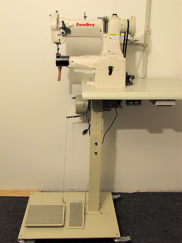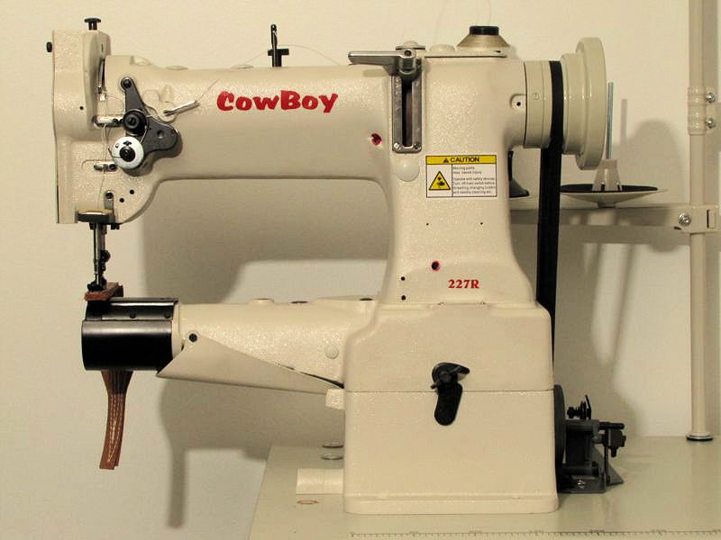 The Cowboy CB227R is an ideal machine for sewing the edges of belts, straps, pancake holsters, shaped and round cases, purses, hats and caps, backpacks and heavy garments (like jeans). This is also a perfect machine for sewing around arm holes, hems and cuffs on both cloth and leather garments, as the circular work can freely revolve around the cylinder arm.
