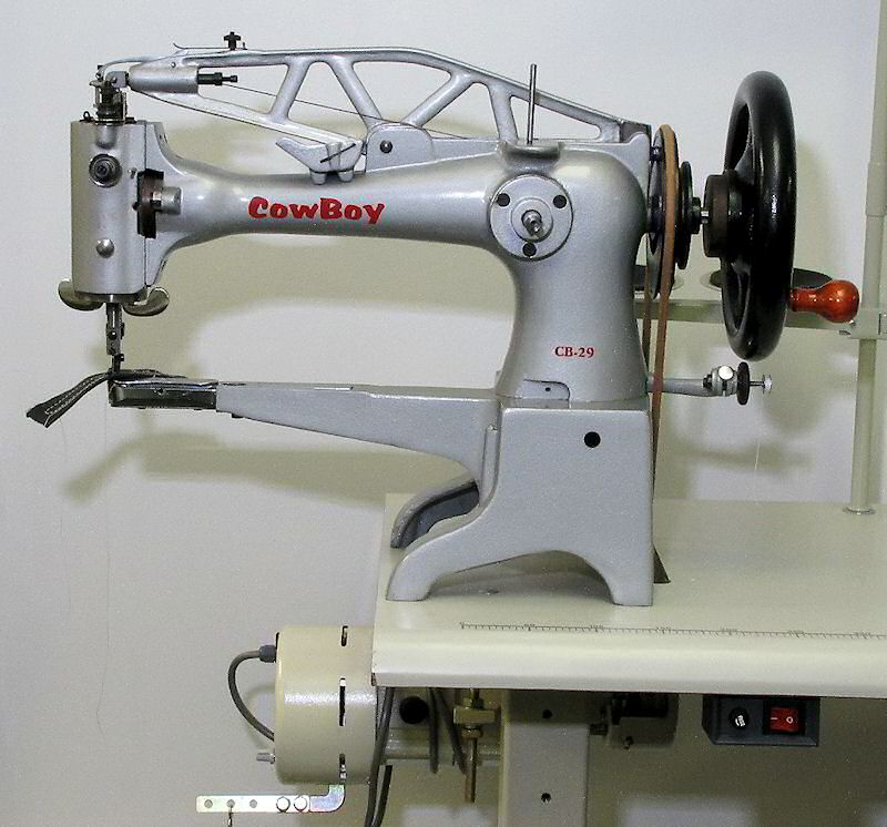 The Cowboy CB29 leather patcher, pictured here (click here for close-up of machine head), is capable of sewing up to 5/16" of light to medium temper leather, with up to #138 bonded nylon or polyester thread.