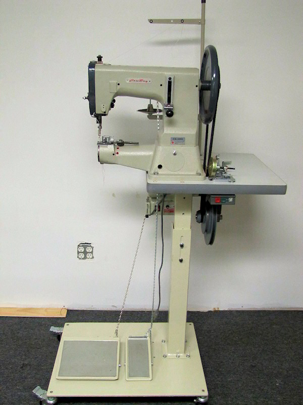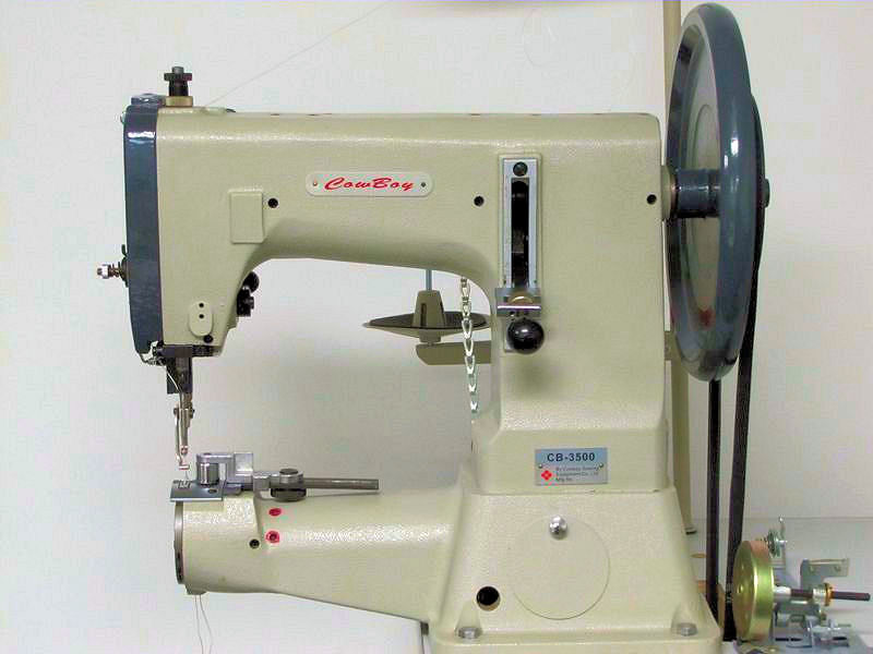 The Cowboy CB3500 leather stitcher, pictured here (click here for close-up of machine head), is capable of sewing up to 7/8" of saddle leather, with up to #415 bonded nylon or polyester thread.