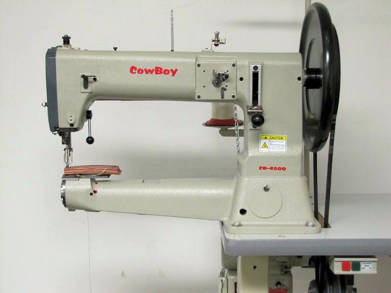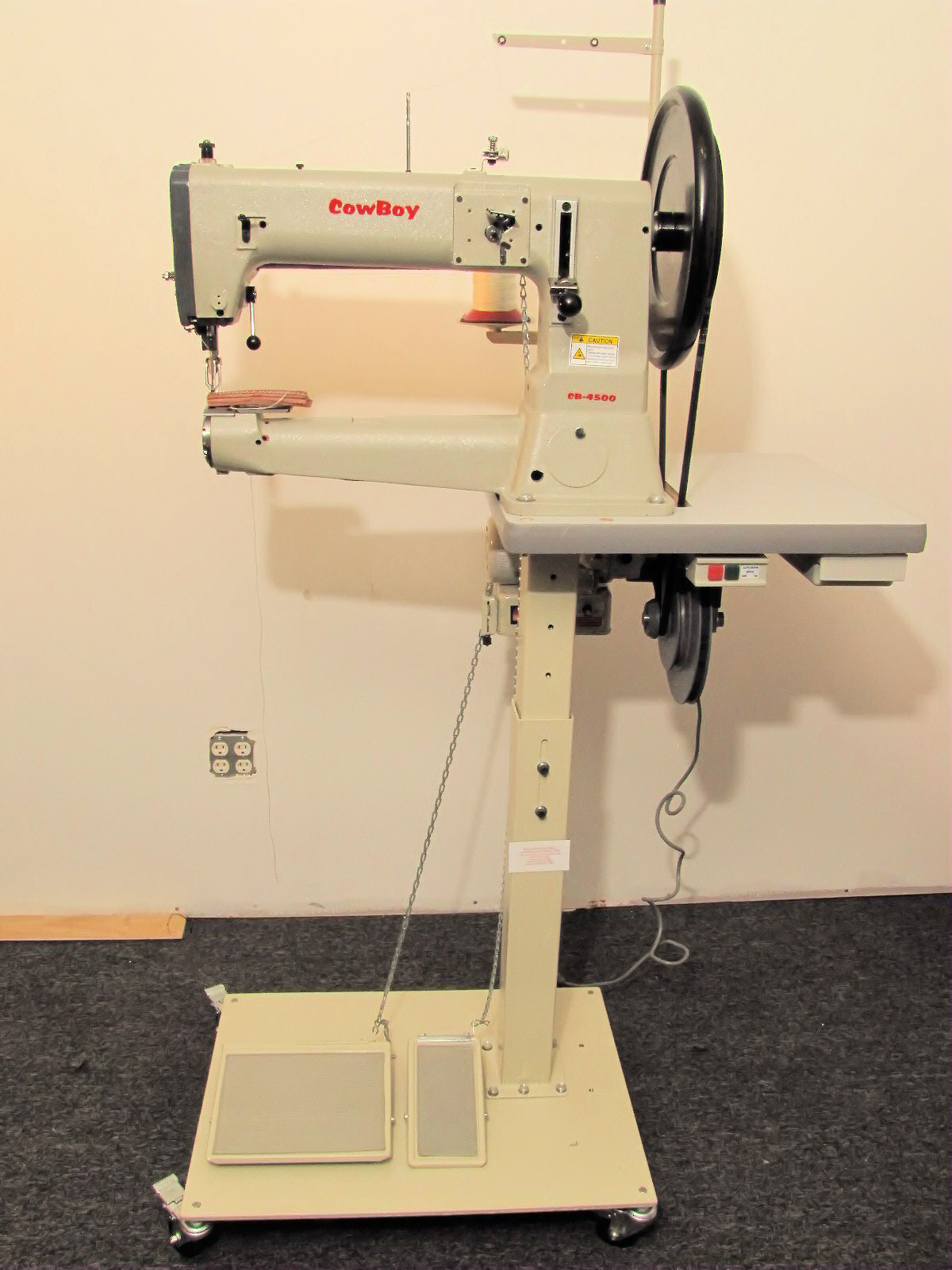 The Cowboy CB4500 leather stitcher, pictured here (click here for close-up of machine head), is capable of sewing up to 7/8" of saddle leather, with up to #415 bonded nylon or polyester thread.